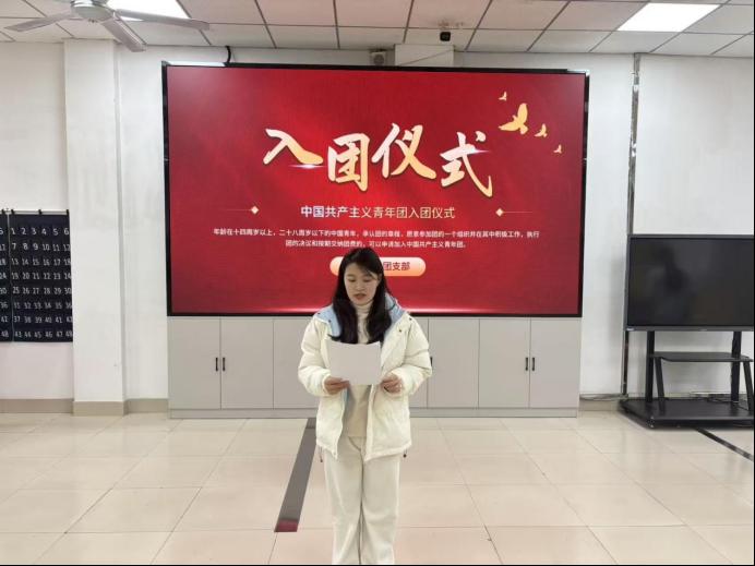 之后由新老团员进行发言,新团员代表李明浩同学在发言中表示,能够加入共青团是一份荣誉,更是一份沉甸甸的责任。未来将以优秀团员的标准严格要求自己,在学习上刻苦钻研,在生活中严于律己,在实践中勇挑重担,不负团组织的培养,不负时代的重托,努力成长为有理想、敢担当、能吃苦、肯奋斗的新时代好青年。老团员代表宋蕊同学分享了自己的入团感悟,鼓励新团员们牢记初心使命,在团组织的引领下锤炼品格、增长才干,用青春的行动书写无愧于时代的篇章。仪式最后,全体人员齐唱《中国共产主义青年团团歌》,激昂的旋律为仪式画上圆满句号。