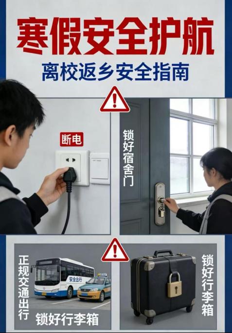 • 离校&返乡:彻底关闭宿舍电源、拔掉所有电器插头,整理好训练装备与个人物品,锁好门窗与储物柜;返乡优先选择高铁、飞机、正规客运等官方认证交通方式,不搭乘黑车、不单独前往偏僻路段,全程妥善保管训练器材、个人财物与证件,及时向家人、老师报备行程动态。