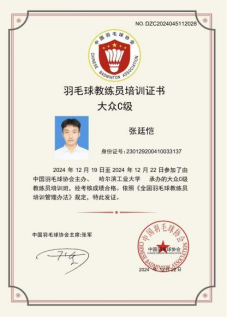 张廷恺,大庆师范学院社会体育指导与管理专业学生。学习态度端正,专业基础扎实,在校期间连续四年荣获奖学金与助学金,综合表现优异。持有教师资格证、普通话二级证书,具备羽毛球大众C级教练员资质,同时拥有羽毛球、田径二级裁判员证书,专业技能全面,实践能力突出。